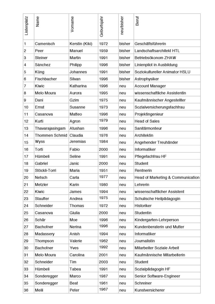 Sechs bisherige Gemeinderät*innen stellen sich gemeinsam mit 30 weiteren Kandidierenden zur Wahl. Diese 36 Persönlichkeiten auf der Liste 2 repräsentieren die Diversität, die Dietikon ausmacht. Sie setzen sich für die Anliegen aus verschiedenen Generationen, aus unterschiedlichen Berufsfeldern und vor allem aus verschiedenen Stadtteilen Dietikons für Dietikon ein und widerspiegeln so breit die Dietiker Gesellschaft.